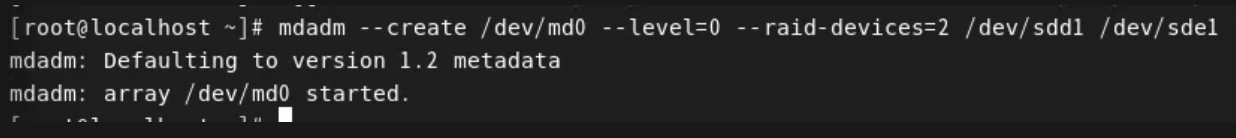 mdadm --create /dev/md0 --level=0 --raid-devices=2 /dev/sdd1 /dev/sde1
