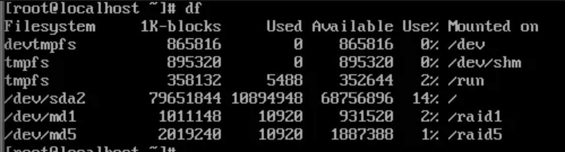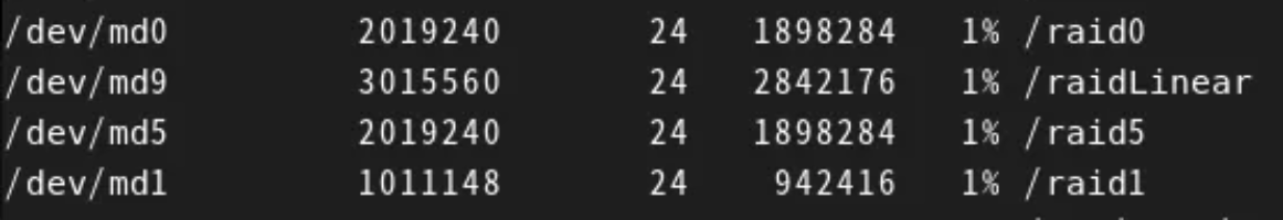 raid1과 raid5는 결함허용 방식인 덕분에, 아직 연결되어 있는 것을 확인할 수 있습니다.