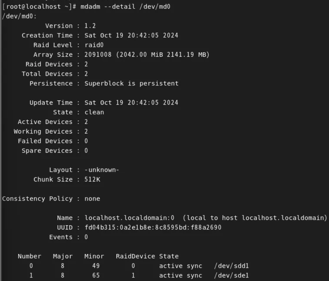 ARRAY /dev/md0 metadata=1.2 name=localhost.localdomain:0 UUID=fd04b315:0a2e1b8e:8c8595bd:f88a2690