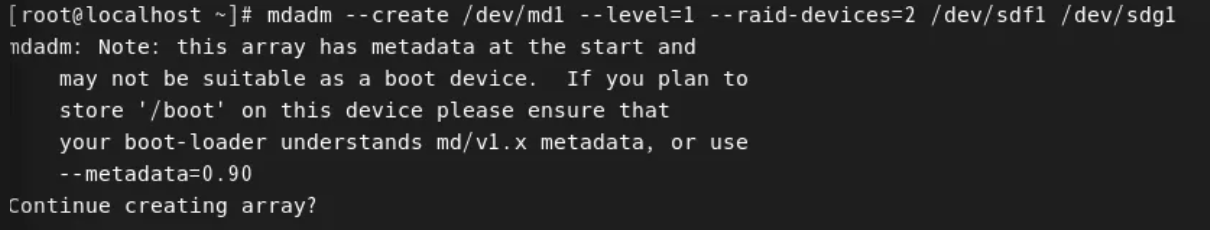 mdadm --create /dev/md1 --level=1 --raid-devices=2 /dev/sdf1 /dev/sdg1
