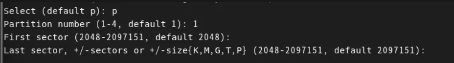 Firsit sector와 Last sector는 파티션의 크기를 의미합니다. enter만 계속 눌러주면, 자동으로 하드디스크 전체 크기를 잡아줍니다.