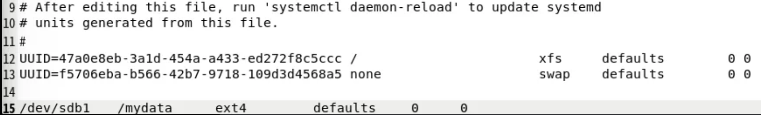 /dev/sdb1 /mydata ext4 defaults 0 0
