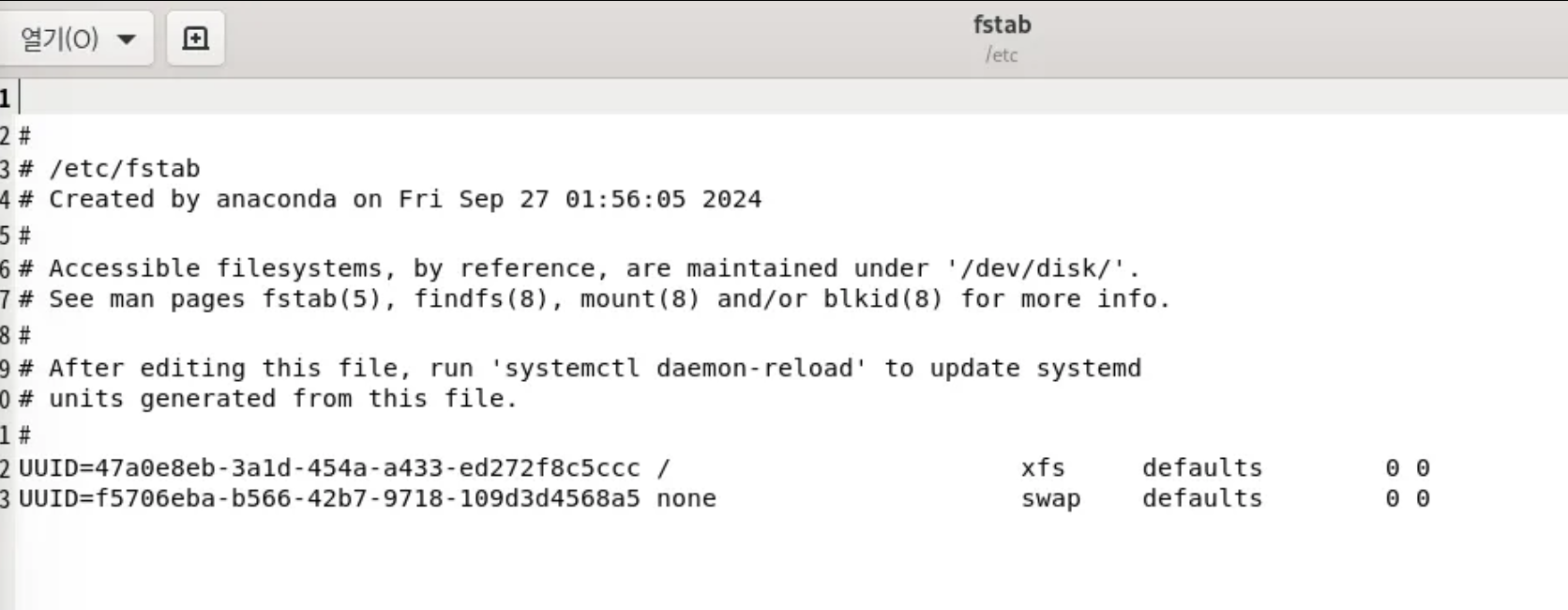 마운트가 재부팅할 때 자동으로 되도록, fstab 파일을 수정합니다.