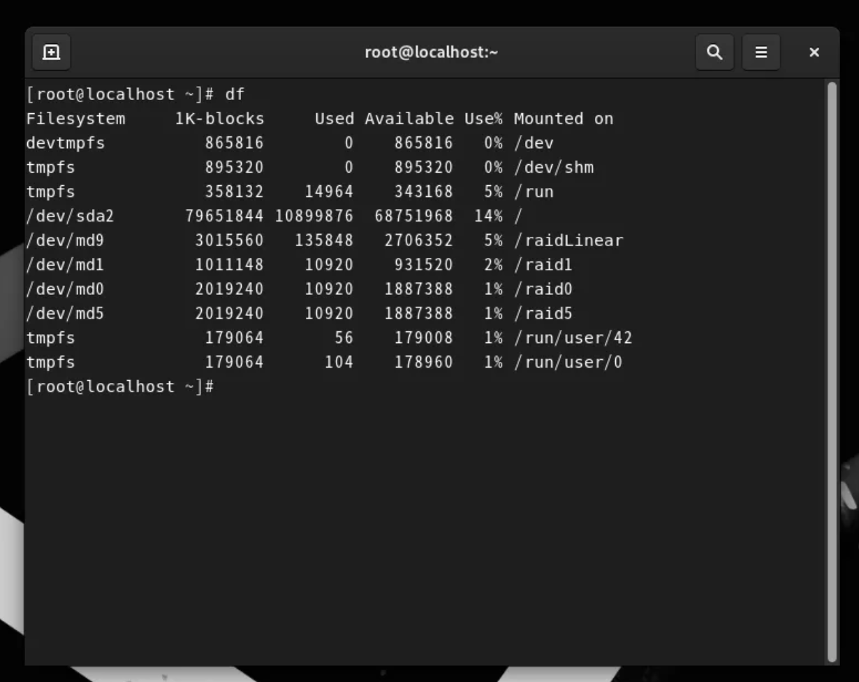 위 명령어로 현재 연결된 raid 디스크를 확인합니다.