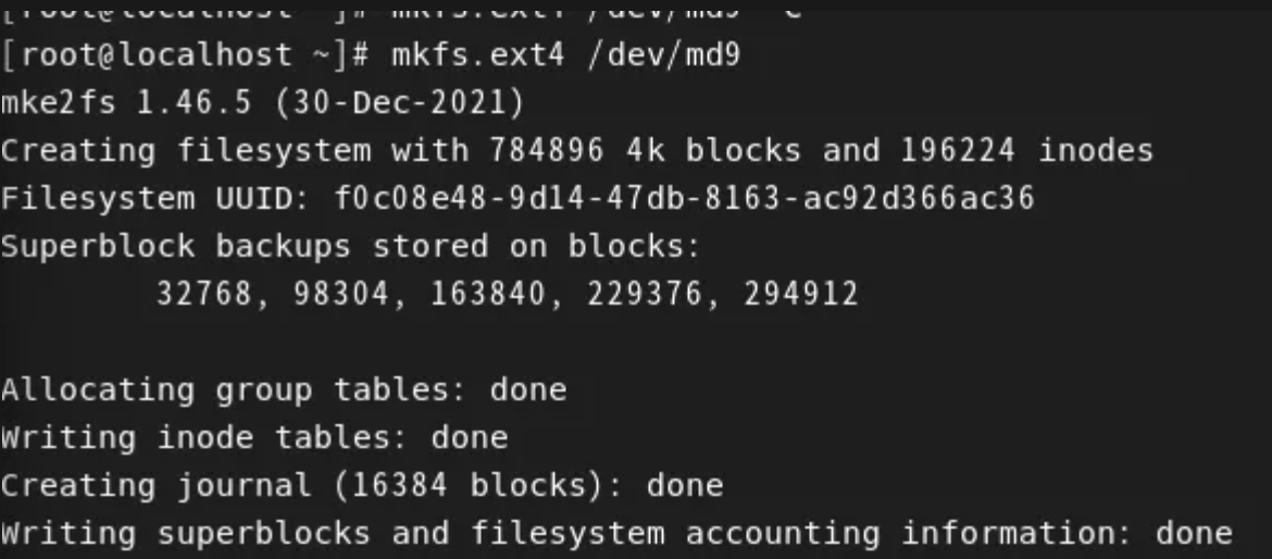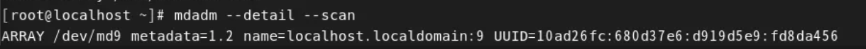 ARRAY /dev/md9 metadata=1.2 name=localhost.localdomain:9 UUID=10ad26fc:680d37e6:d919d5e9:fd8da456
