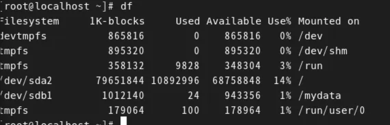 위 명령어로 현재 연결된 디스크를 확인할 수 있는데, 재실행을 해도 자동으로 /mydata에 /sdb1이 연결된 것을 확인할 수 있습니다.