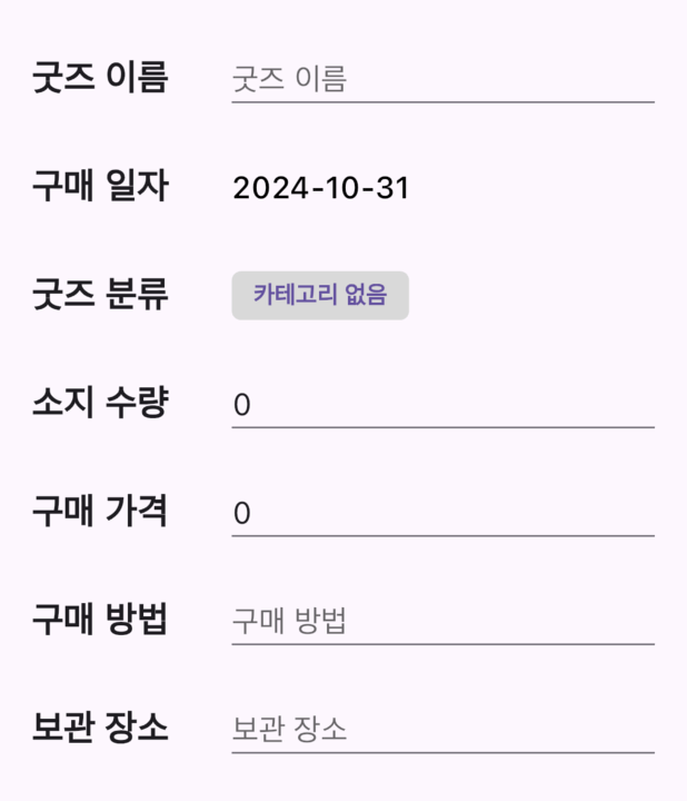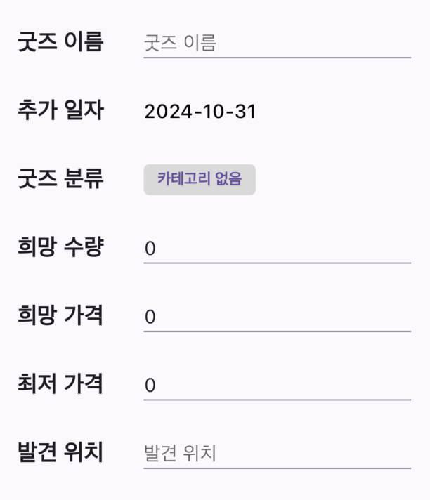 | [굿위시 제작기] 10. 굿즈 추가 페이지 제작과정 - TextInput 그리고 굿즈 등록 버튼 (1) | 2024.10.19 |