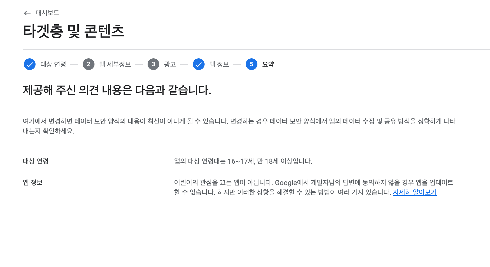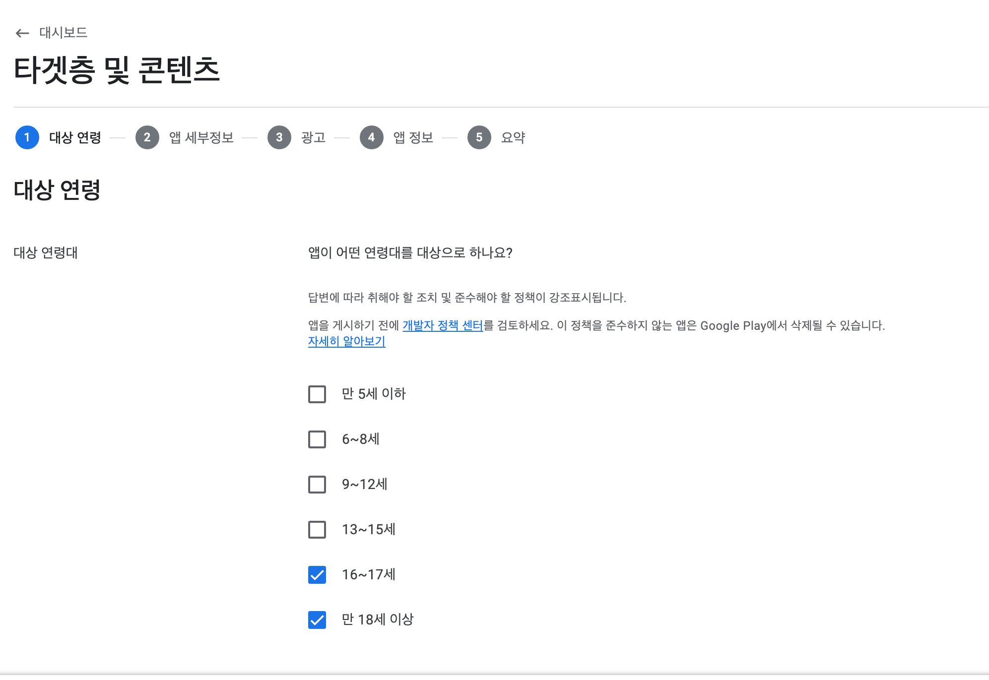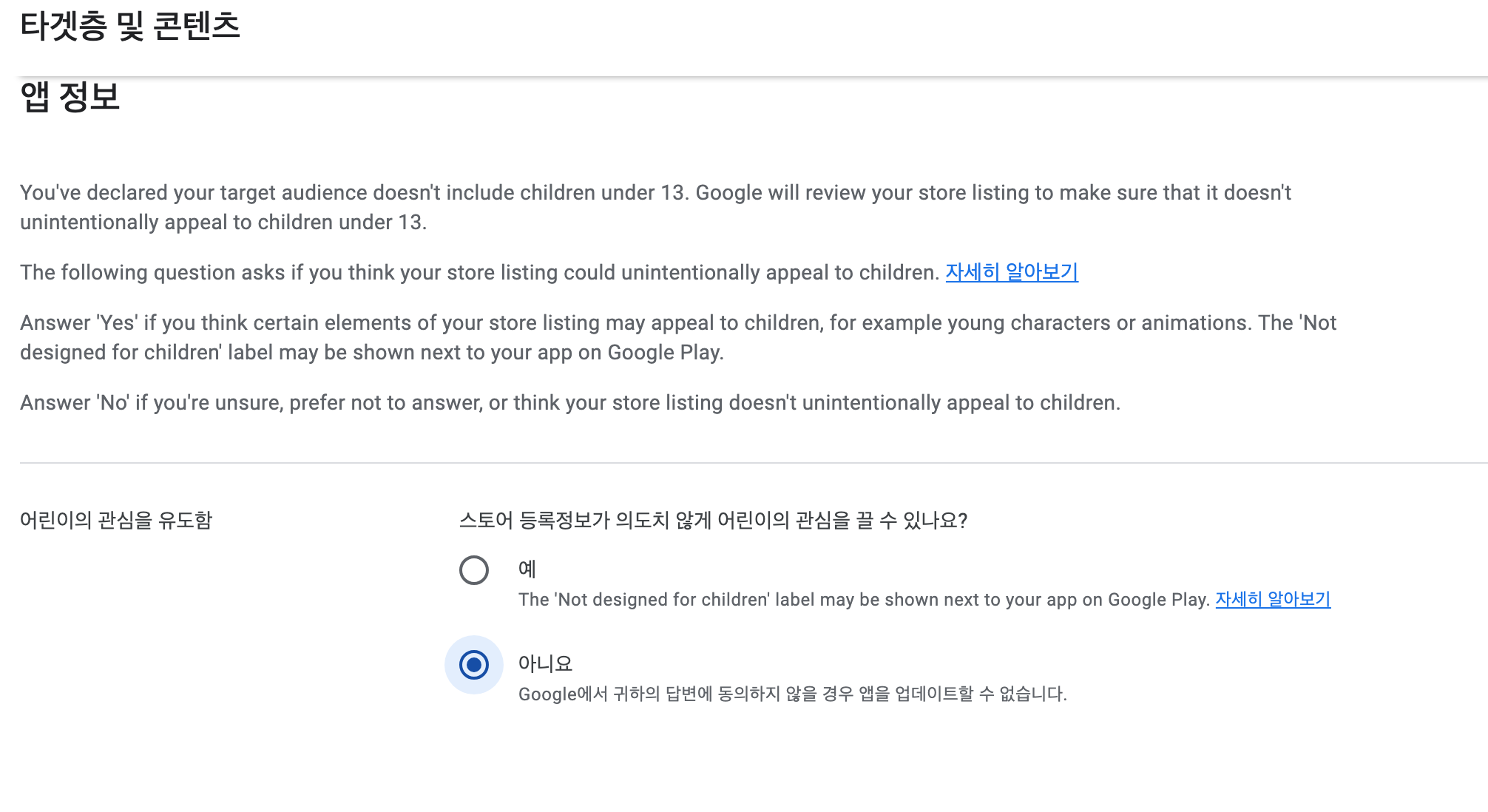 타겟층을 선택할 때, 15세 이하 부분을 선택할 경우, 청소년 이용 안전성에 대한 별도의 검사과정이 들어갑니다.