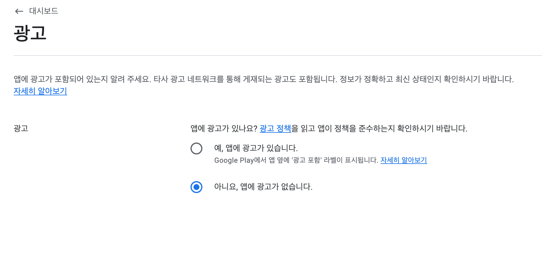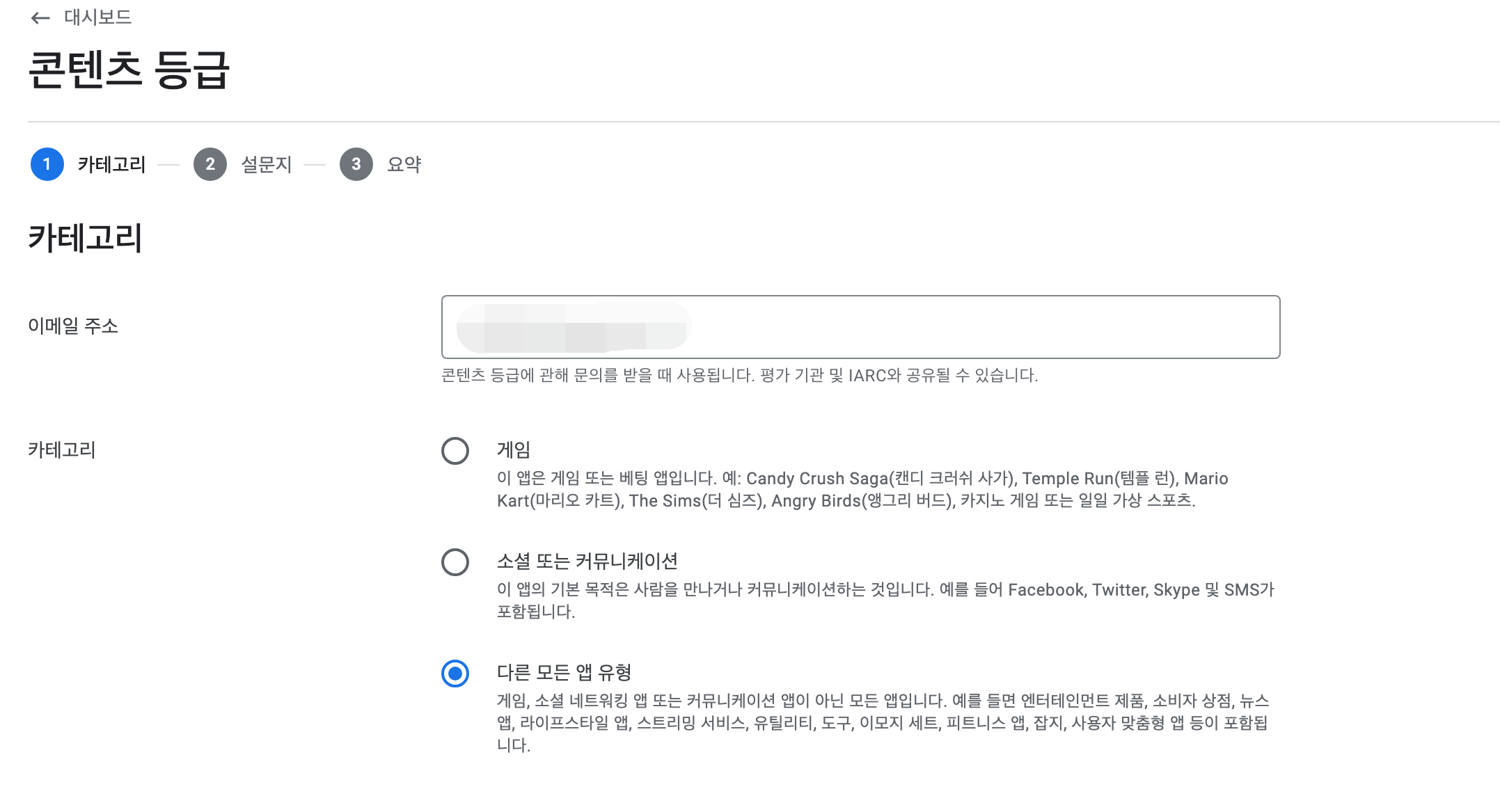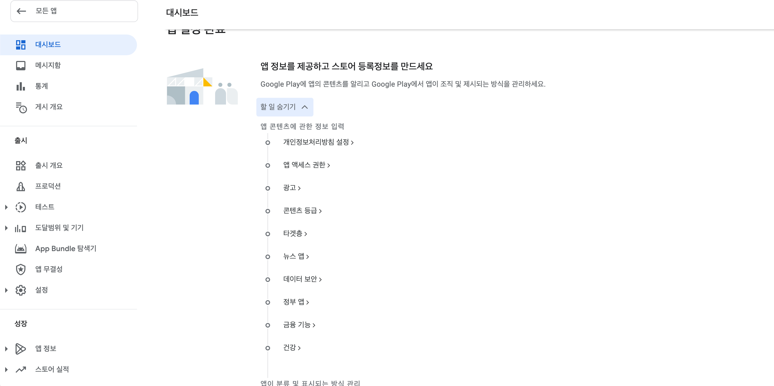 우선, '앱 콘텐츠에 관한 정보 입력' 절차를 하나식 밟아보겠습니다.