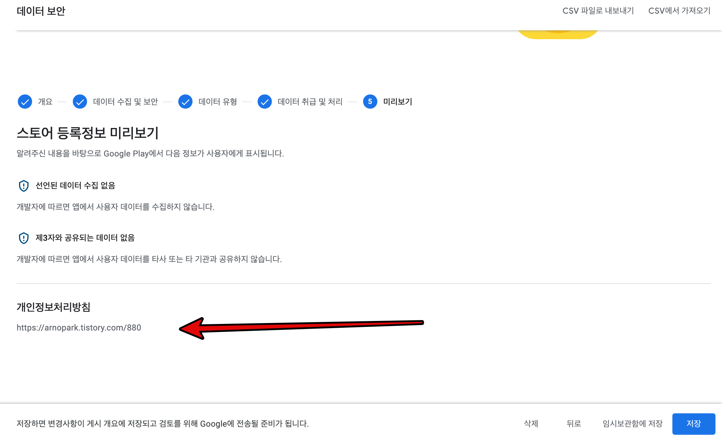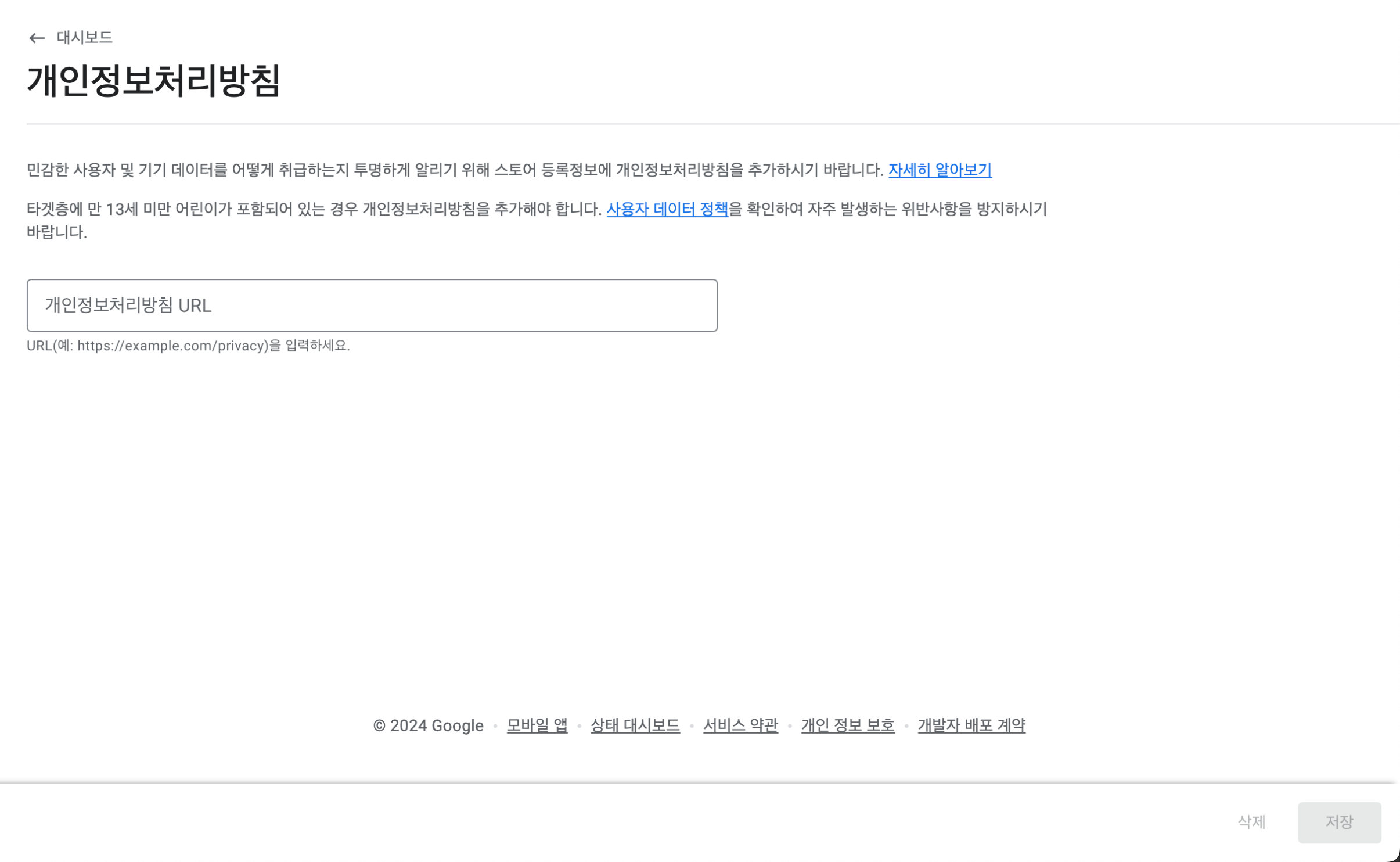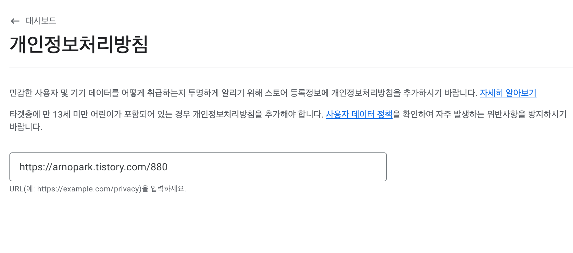 아까 사전에 설정한 '개인정보처리방침 URL'도 확인할 수 있습니다.