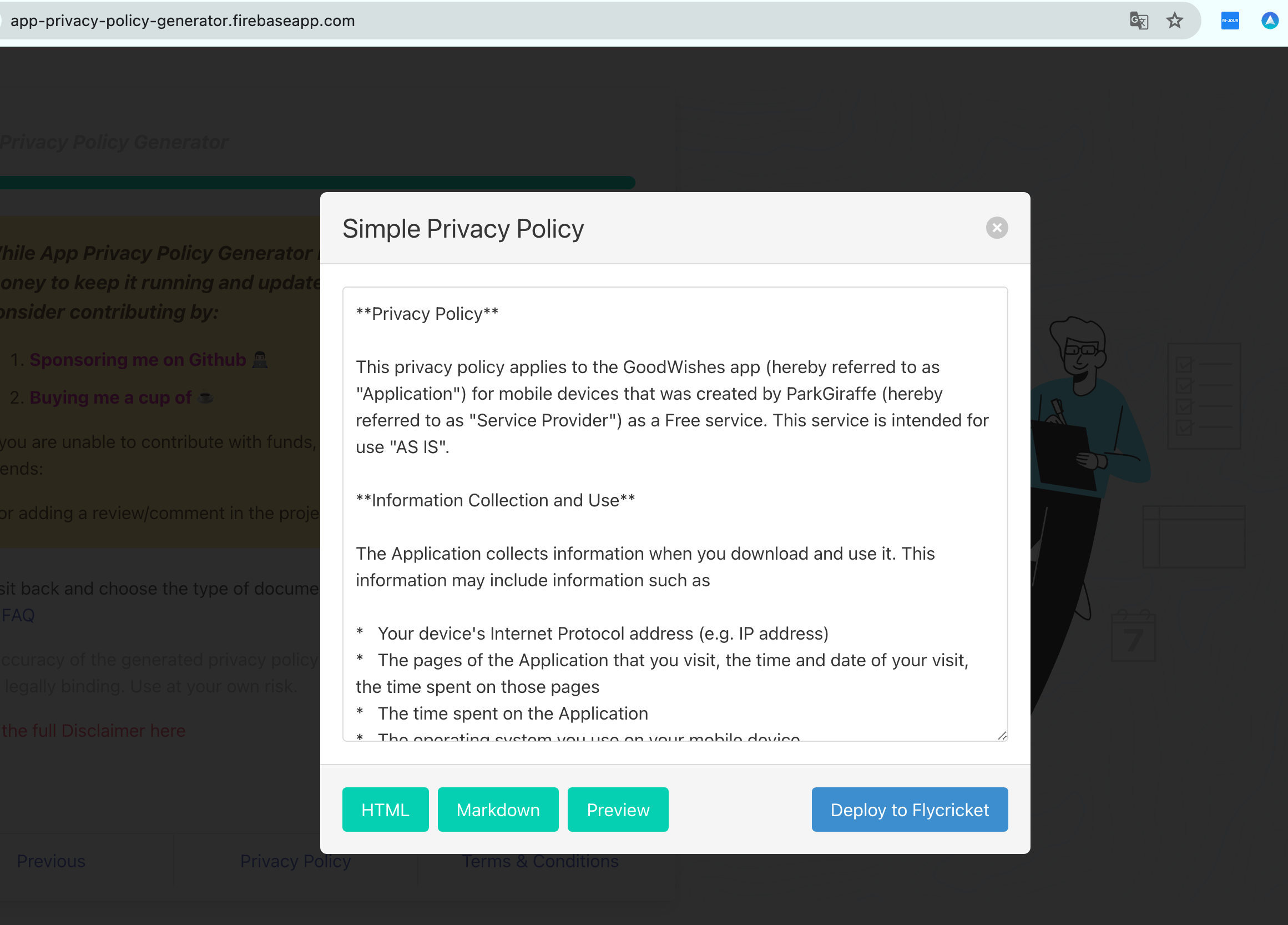 바로 위 사이트를 통해, 앱 이름과 특징만 알려주면 쉽고 빠르게 '개인정보처리방침'을 생성할 수 있습니다.