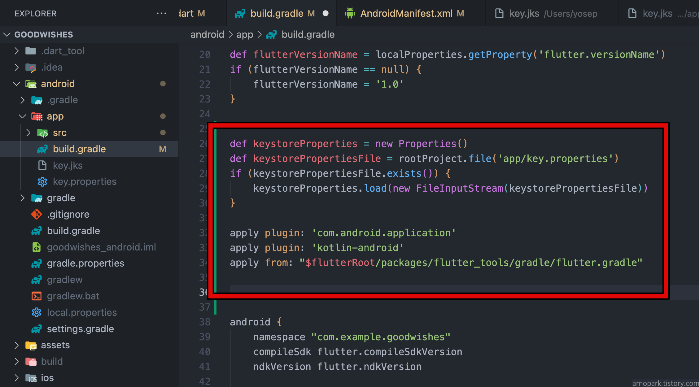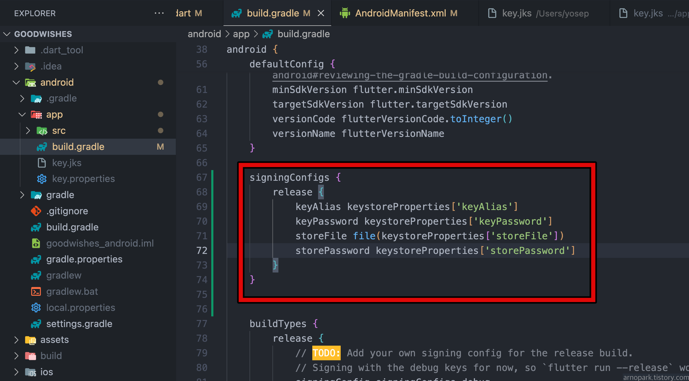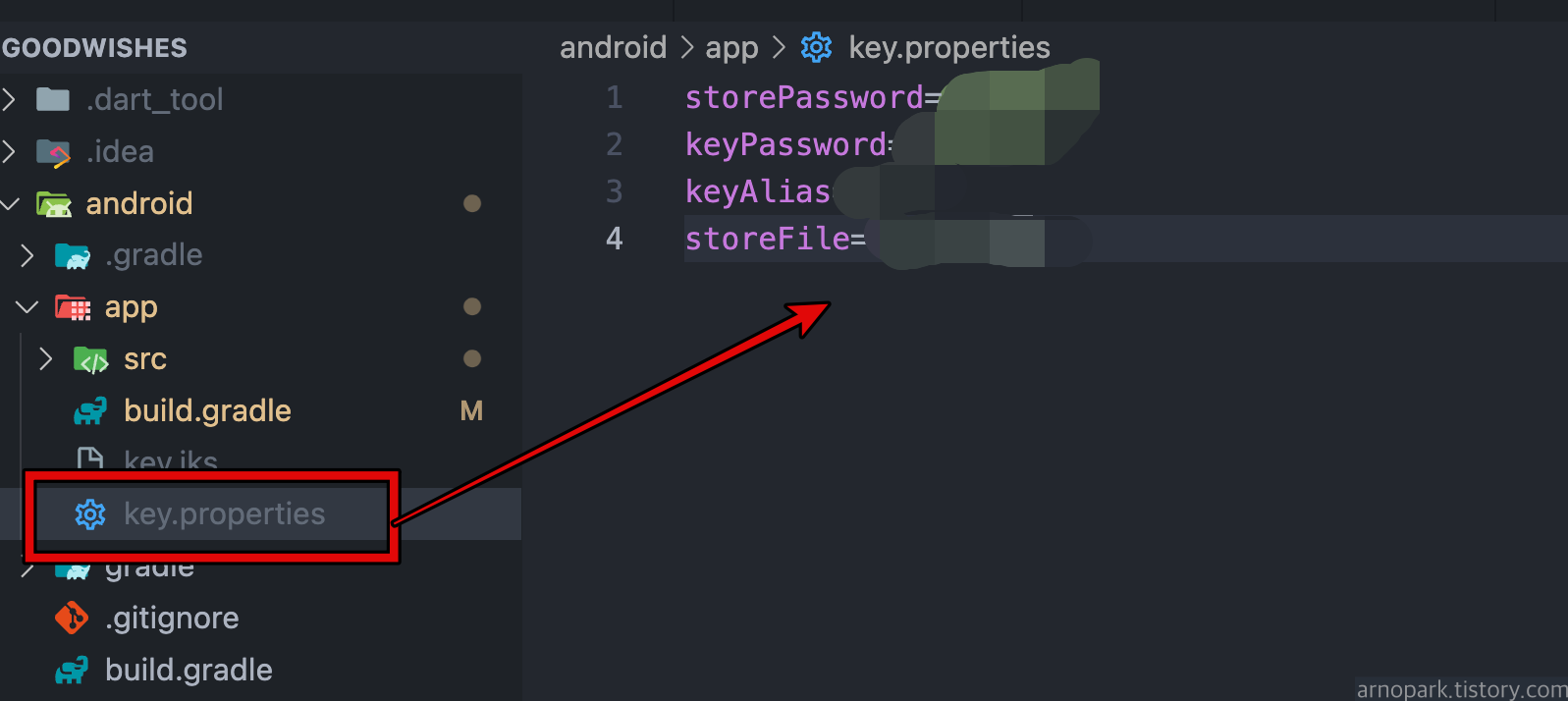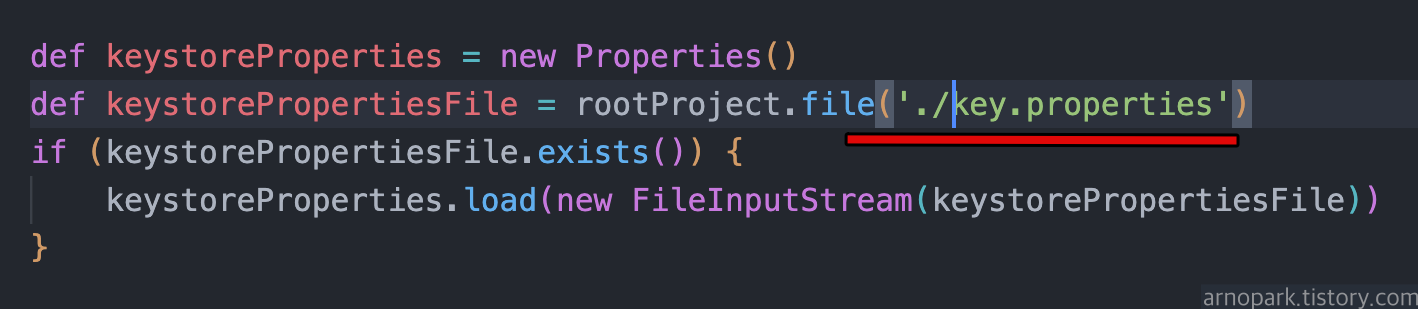 key.properties파일은 android/app 폴더에 저장해놨기 때문에,