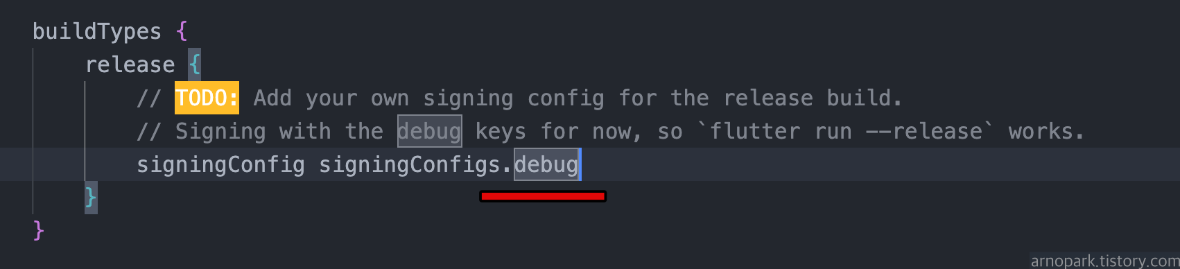 buildTypes에 signingConfig의 debug를 release로 변경합니다.