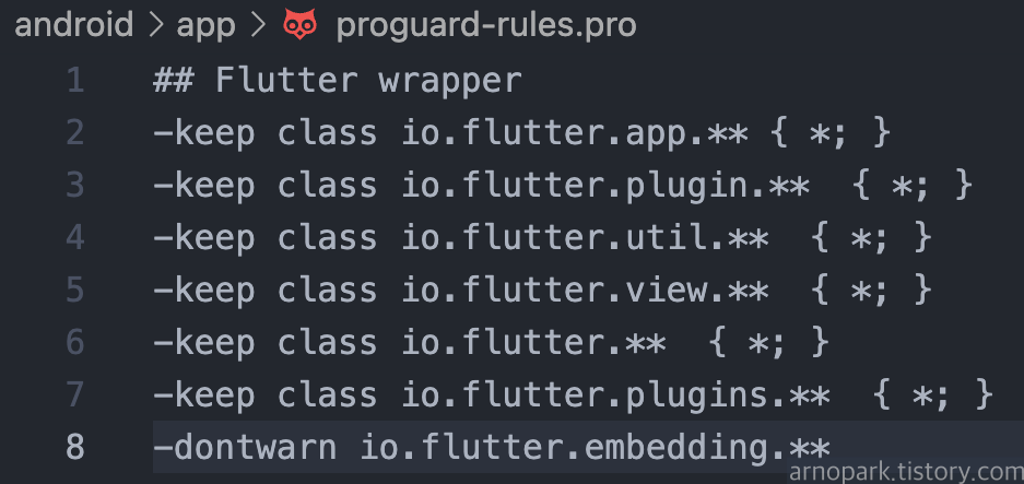proguard-rules.pro를 작성한 후, android/app/build.gradle파일의 buildTypes 코드 안에