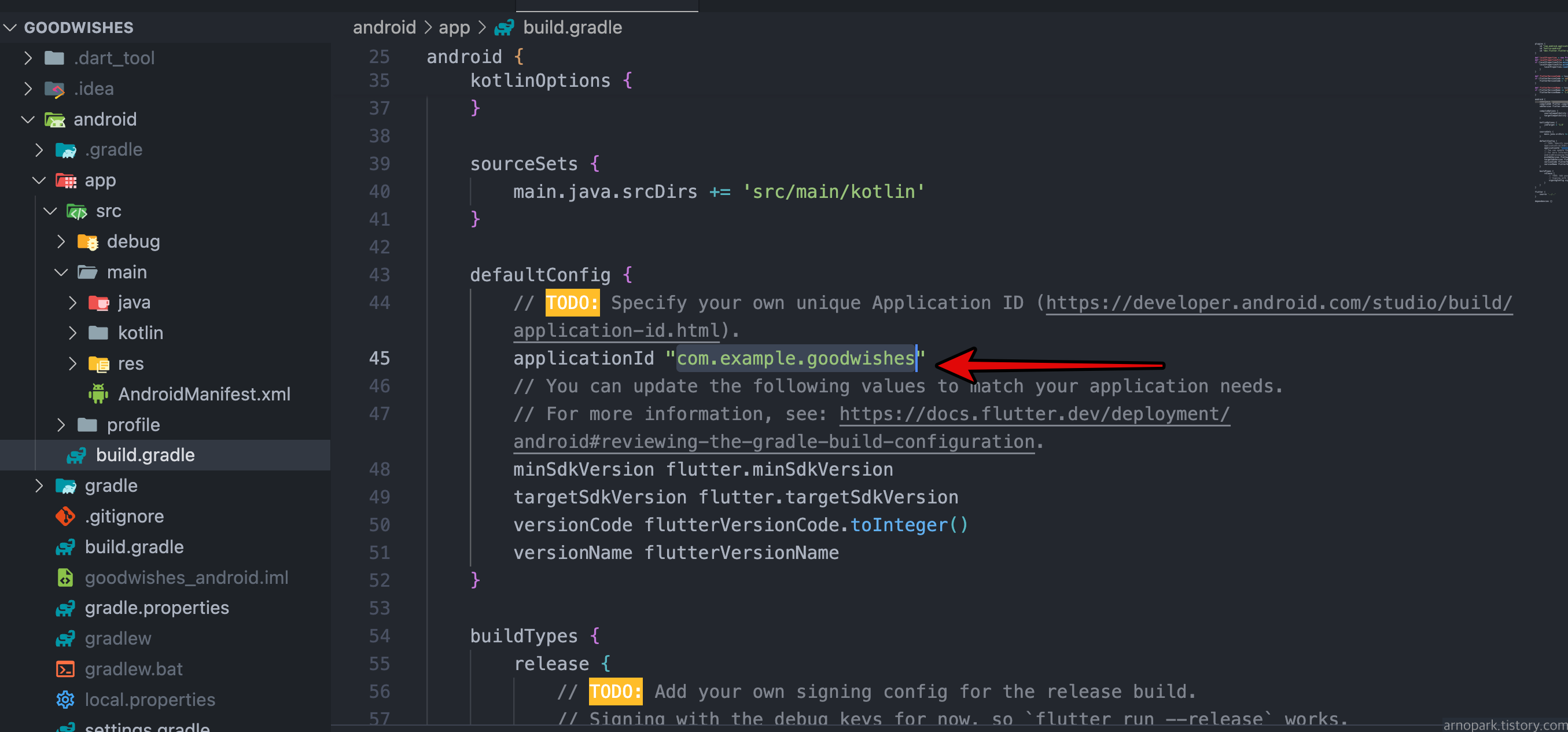 사진의 applicationId 부분에 "com.개발자이름.앱이름"을 적어줍니다.