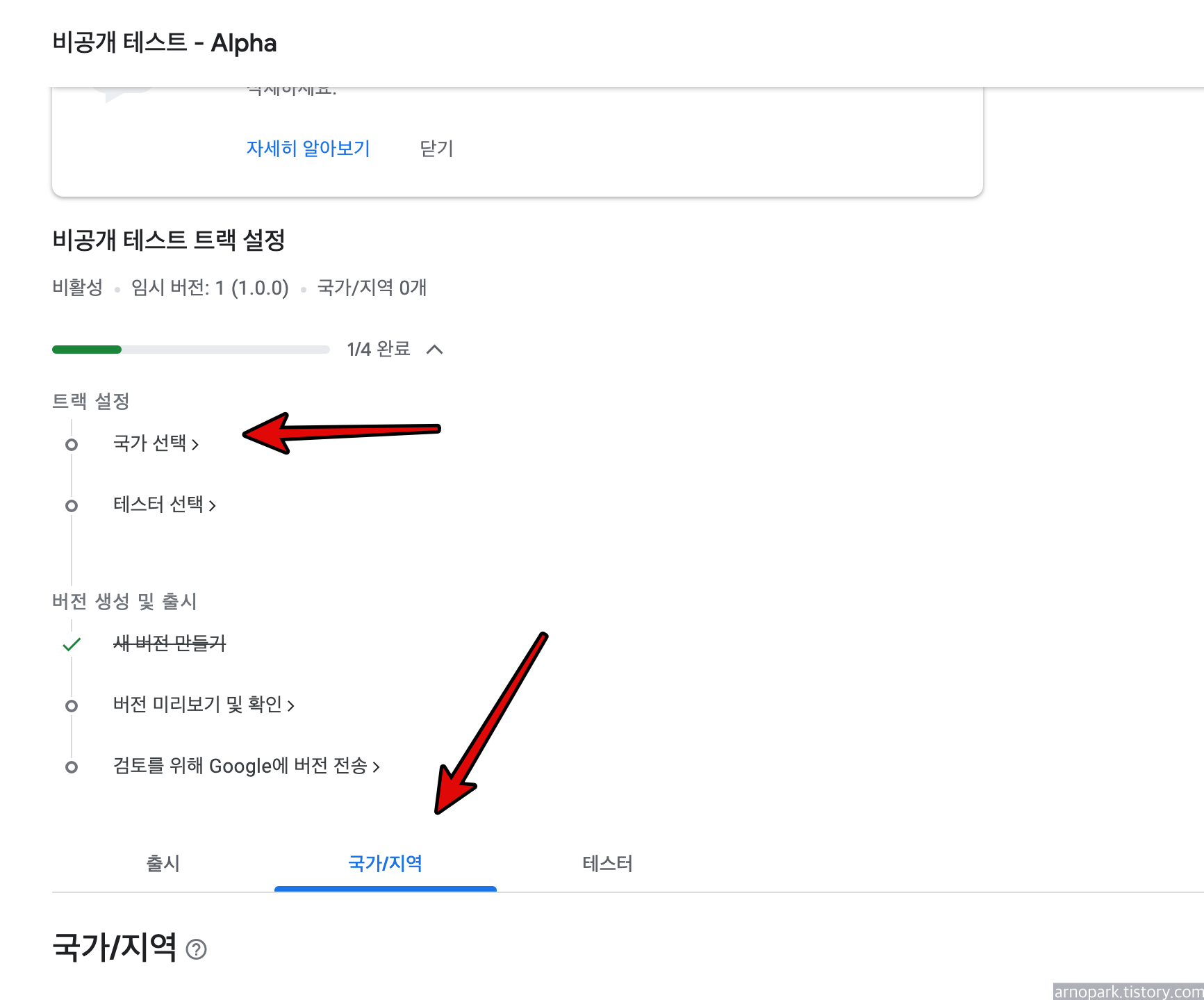비공개 테스트 탭에서 국가를 선택할 수 있습니다.