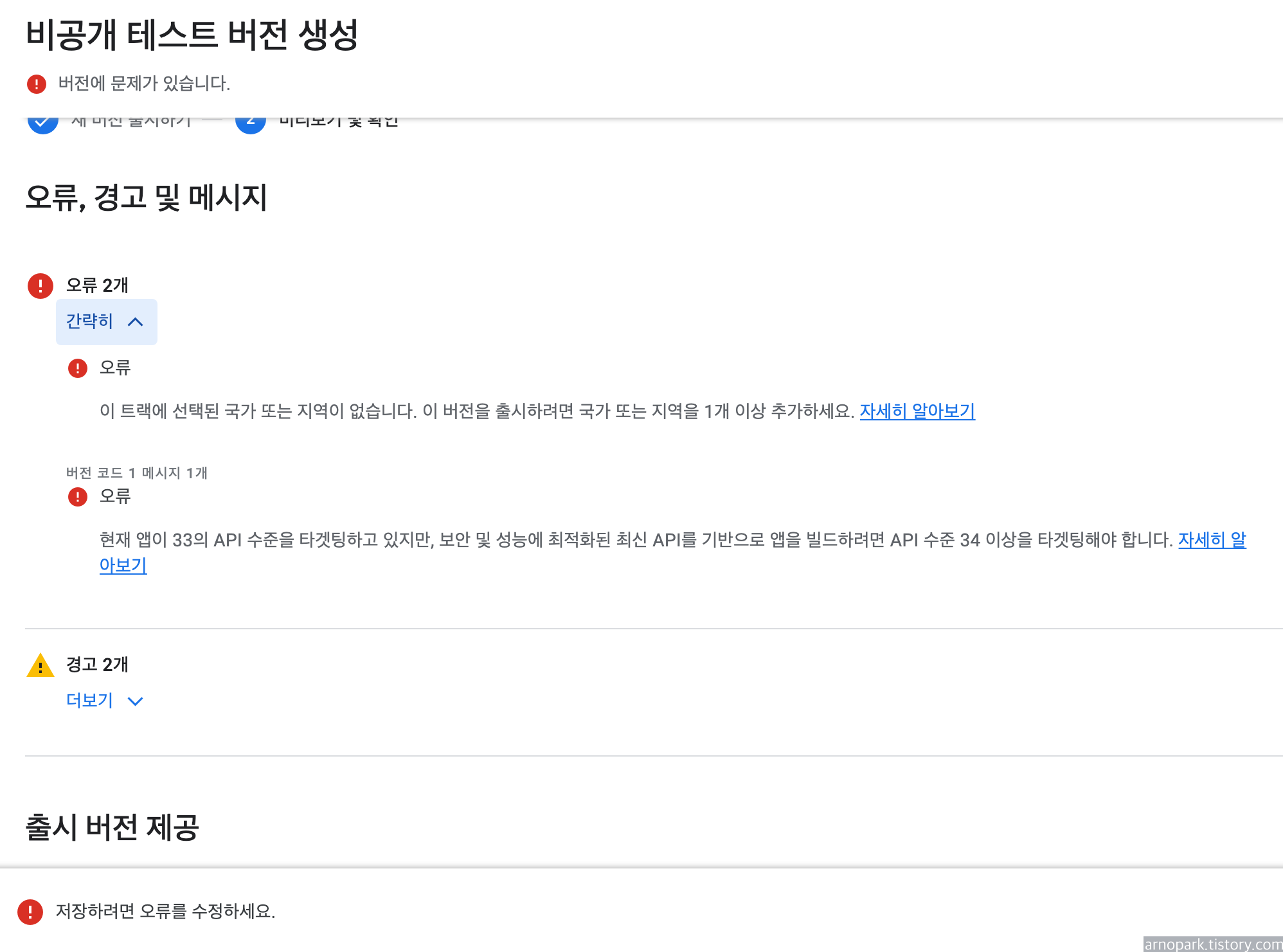 2차 제출 실패 : 국가/지역 설정과 API 타겟 SDK 지정