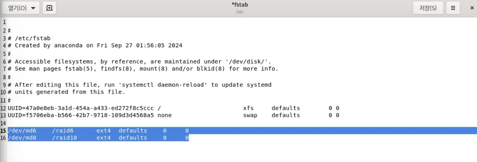 이제 md6와 md10이 재부팅될 때 자동으로 마운트되게 설정해야 합니다.