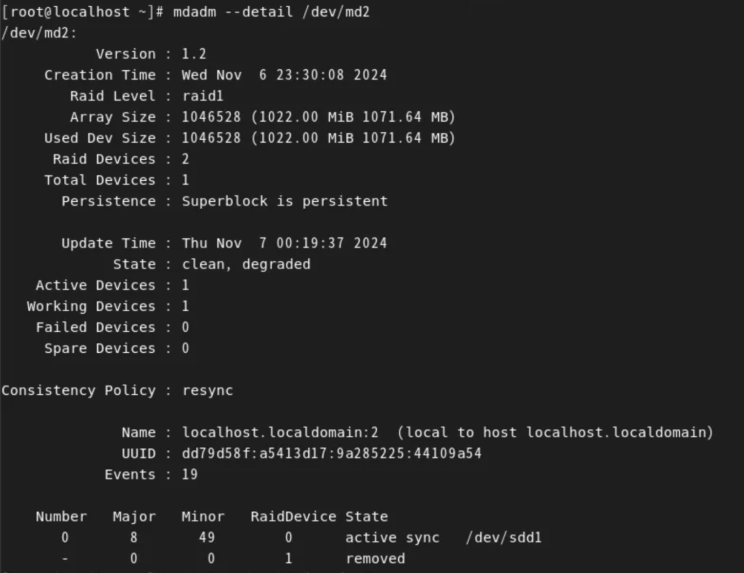 - RAID 1+0은 md2와 md3에 연결된 하드디스크 각각 1개 씩 총 2개