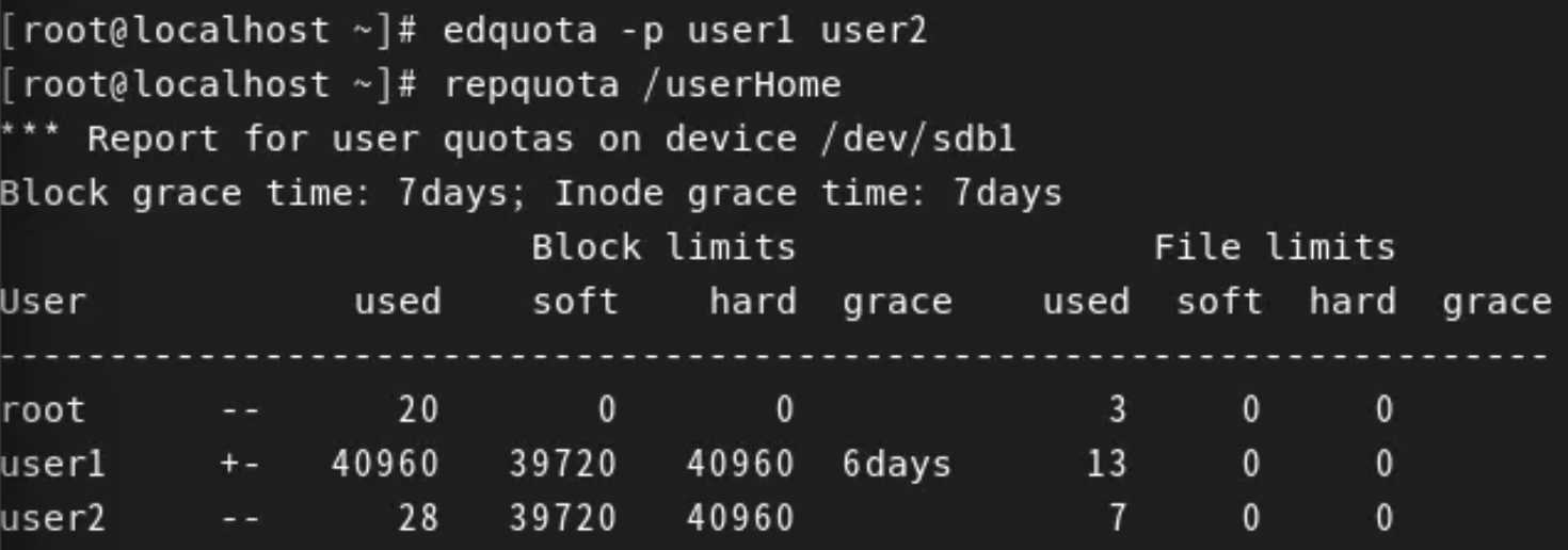 edquota -p user1 user2