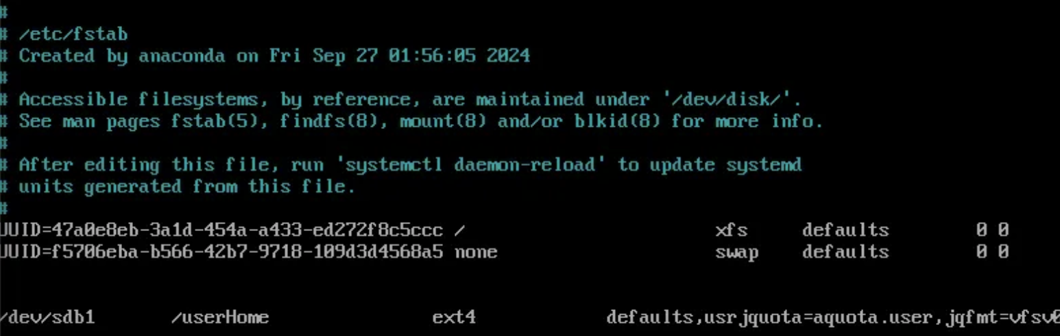 이제 fstab에서 /userHome을 쿼터용으로 등록해야 합니다.