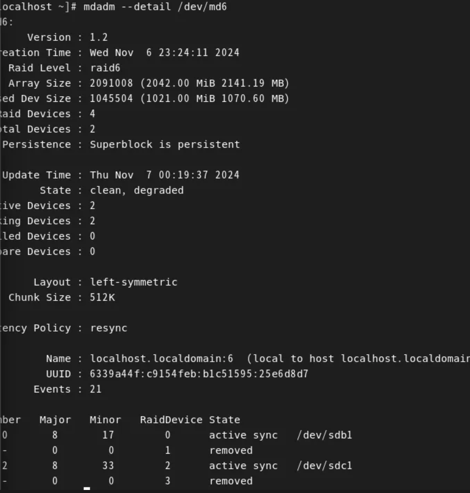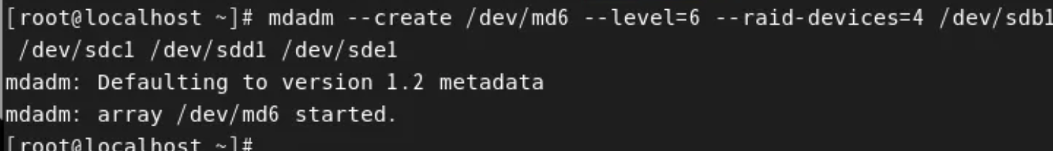 mdadm --create /dev/md6 --level=6 --raid-devices=4 /dev/sdb1 /dev/sdc1 /dev/sdd1 /dev/sde1