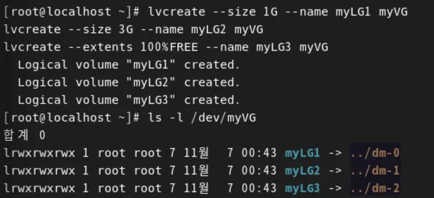 lvcreate 명령어로, myVG 볼륨그룹에서 1gb, 3gb, 1gb 세 개의 논리볼륨을 만듭니다.