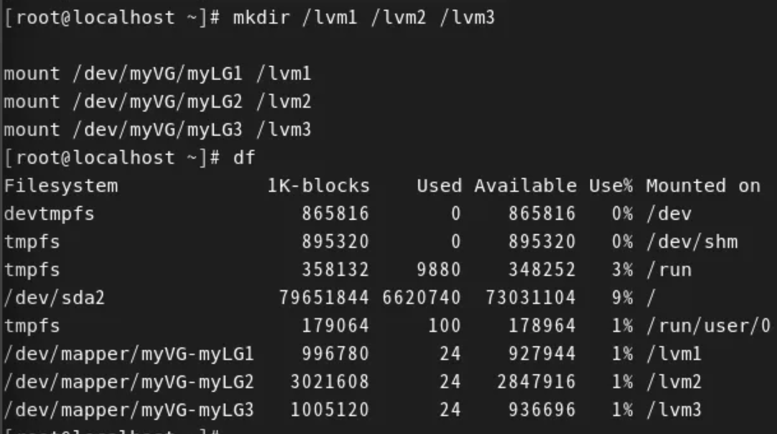 mkdir /lvm1 /lvm2 /lvm3