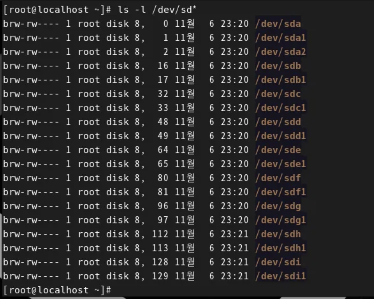 /dev/sdb ~ /dev/sdi 까지 전부 파티셔닝합니다.