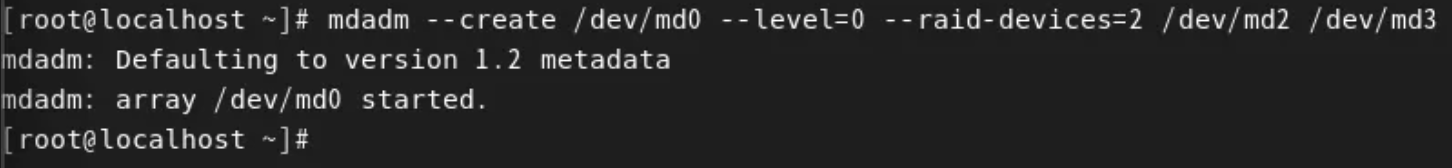 mdadm --create /dev/md0 --level=0 --raid-devices=2 /dev/md2 /dev/md3