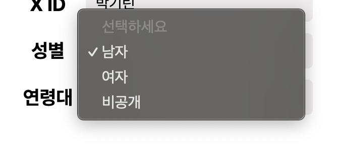 성별의 경우 '남자, 여자, 비공개'를 미리 개발자가 지정한 다음 드롭다운 메뉴로 제공하면, 사용자는 쉽게 목록에서 자신에게 해당되는 걸 선택하면 끝입니다.