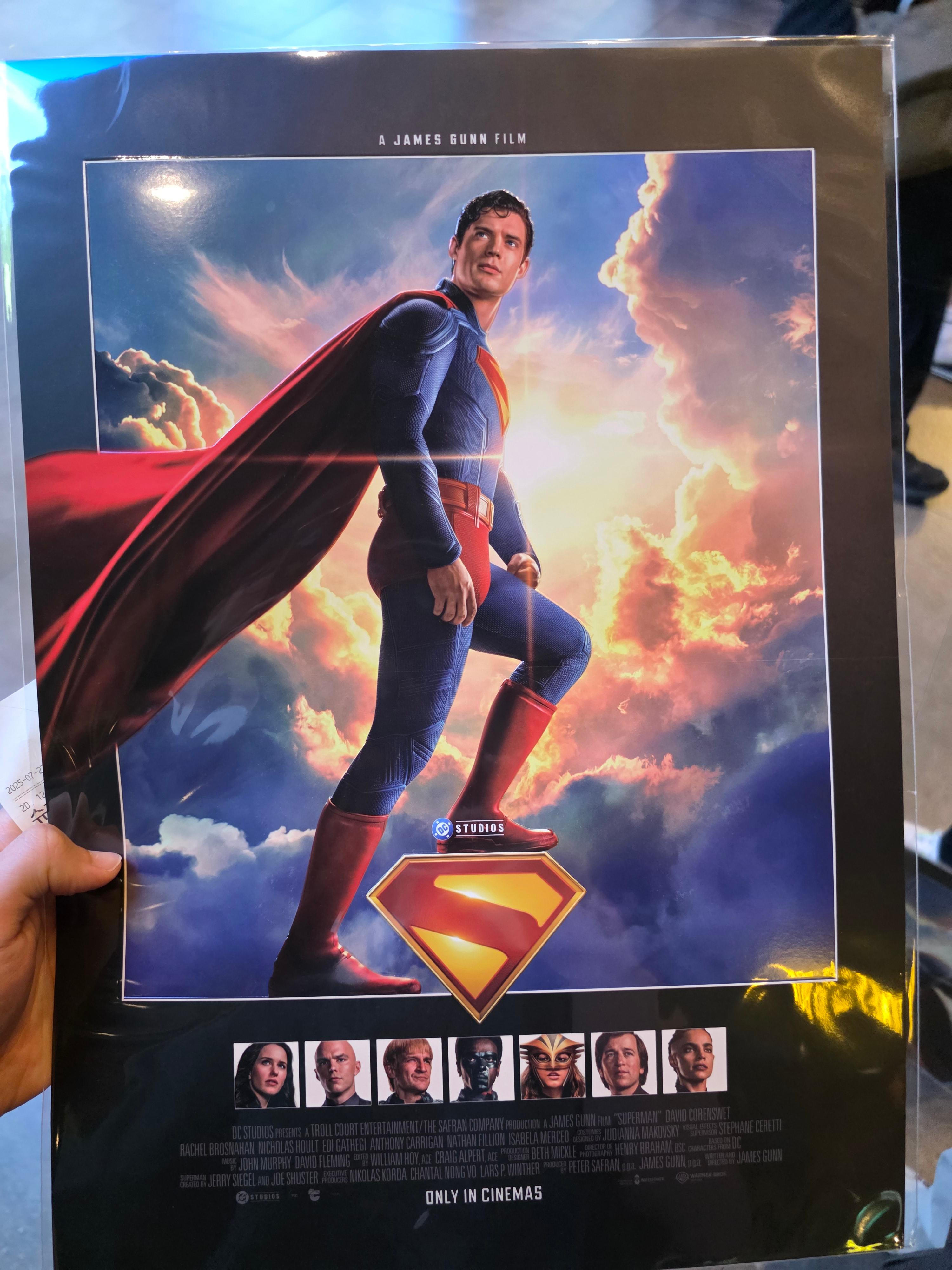 고전 슈퍼맨, 맨 오브 스틸의 슈퍼맨을 볼 기회는 여럿 있었지만, 계속 미뤄만 뒀다. 시원한 액션씬과 화려한 그래픽으로 추천을 받았었지만, 이후 ‘배트맨 vs 슈퍼맨', ‘저스티스 리그'의 평가가 좋지 못한 것을 보고 시도하기도 전에 마음이 식어버렸었다. 몇 년이 지나, ‘더 배트맨'이라는 새로운 배트맨 영화가 상당히 도전적이면서도 괜찮다는 평가를 받는 걸 보고 DC 영화에 다시 관심이 생기기 시작했다. 그리고 최근에, 새로운 슈퍼맨 시리즈가 시작된다는 소식에 사전 지식이 부족한 내가 당장 보기에 괜찮아보여서 관람을 도전했다. 게다가 예쁜 후가공 포스터를 주는 것 역시 끌림 포인트였다.